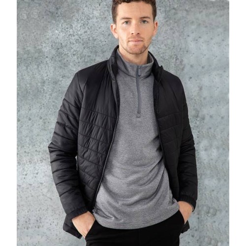 Polyester padding. Shower resistant. Topstitched quilting. No quilted stitching on chest and top of back. Stand up collar. Full length zip with non-slip puller. Side panels. Inner pocket. Two front concealed zip pockets. Elasticated cuffs. Cut out label. Zip access for decoration.