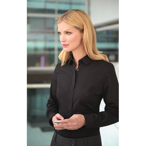 Semi fitted women's blouse with rounded collar, Fly front, single button cuff, Superb stretch fabric, easy to iron.Fabric Information