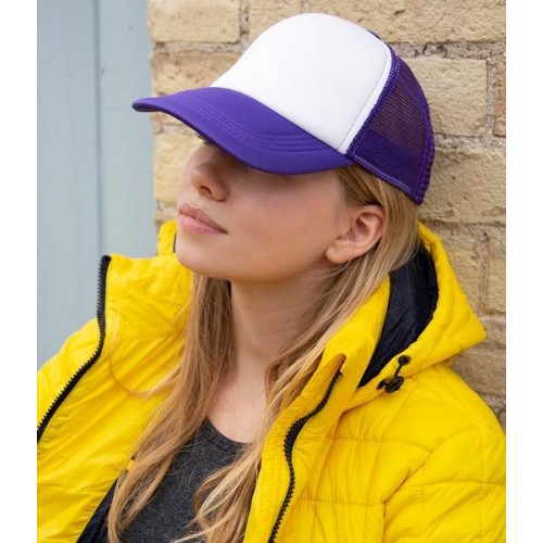 Mesh rear panels. 5 panel. White front panel with colour contrast and peak. Semi-curved recycled PE peak. Snapback size adjuster. Tear out label.