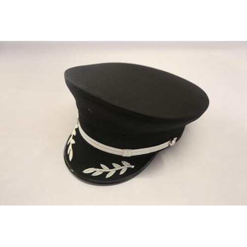 Black brushed fabric with silver braid around the front with two added silver braid decorations on the peak.
