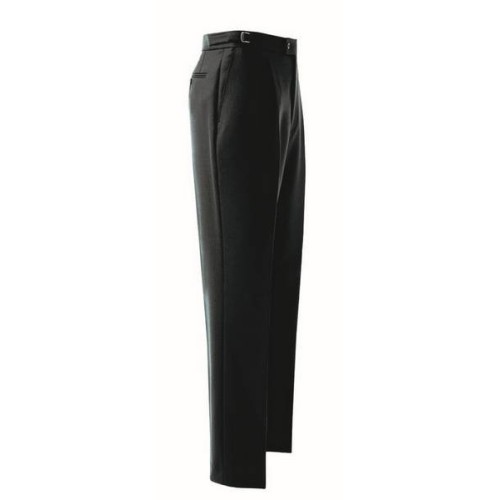 Single pleat trouser, slant side pockets, one hip pocket, side buckle adjusters, classic fit