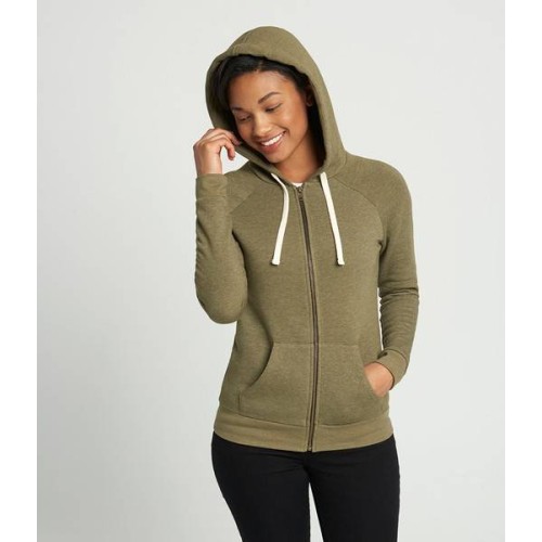 Brushed back fleece. Raglan sleeves. Two panel jersey lined hood with flat natural drawcord. Full length metal YKK zip. Front pouch pockets. Ribbed cuffs and hem. Tear out label.