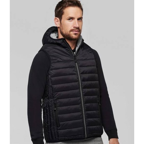 Polyester padding. Contrast polyester lining. Warm and ultra-lightweight. Grown on hood with bound opening. Full length contrast zip with chin guard and inner zip guard. Two front zip pockets - right with fluorescent media pocket and ear phone cord access. Bound elasticated armholes and hem. Packs away into unbranded bag.