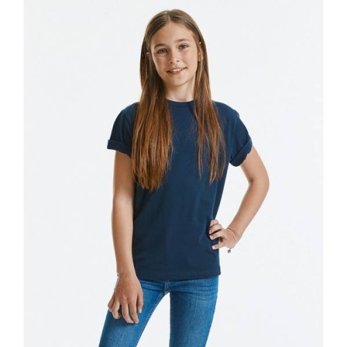 Narrow ribbed collar with Lycra®. Taped neck and shoulders. Side seams. Twin needle sleeves and hem. Unbranded size label at neckline.