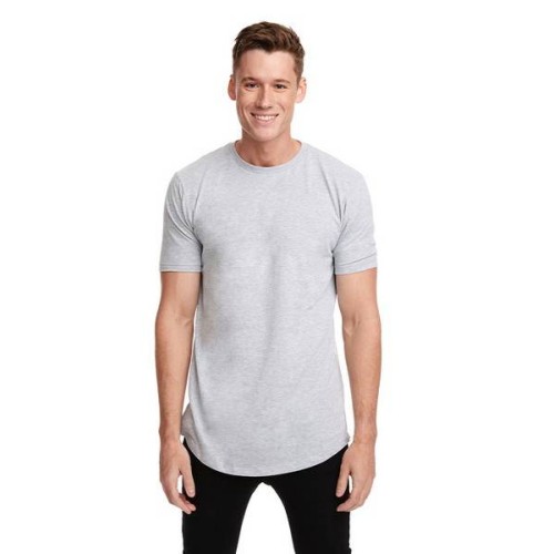 1x1 baby ribbed collar. Taped neck and shoulders. Side seams. Longer length. Twin needle sleeves and hem. Curved drop hem. Tear out label.