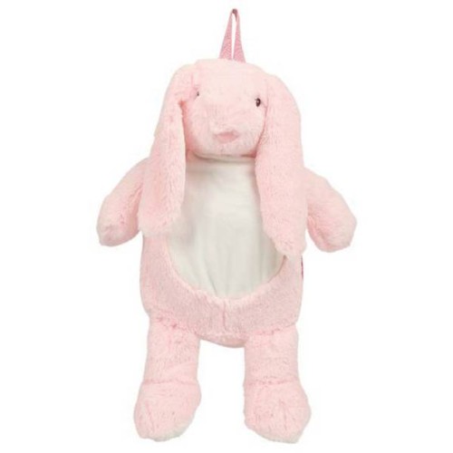 Soft plush pink bunny backpack. Nylon webbing straps and handle. Contrast ears and nose. Sewn eyes. Zip access for decoration onto front panel. Suitable for embroidery, print and sublimation.