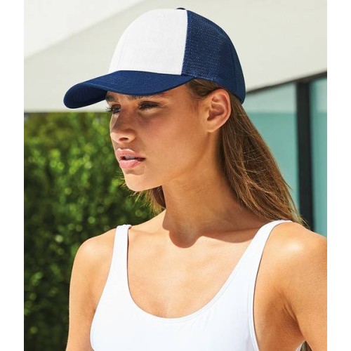 Polyester mesh rear panels. 6 panel. Structured front panels. Stitched ventilation eyelets. Semi-curved peak. Snapback size adjuster. Tear out label.
