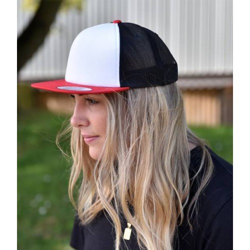Polyester mesh rear panels. 5 panel. High profile. Stitched eyelets. Foam front panel. Flat peak. Plastic snapback size adjuster. Authentic visor sticker.