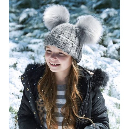 Sumptuous heavy ribbed knit. Cuffed design for oprimal decoration. Non-removable luxury faux fur pom..
