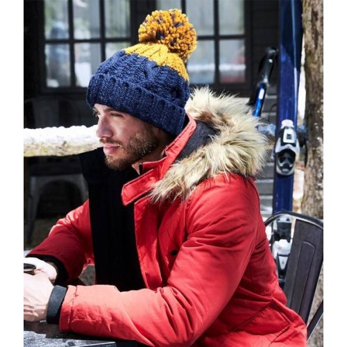 Heavyweight multi-yarn cable knit. Bold two colour design. Cuffed design for optimal decoration. Luxurious shearling thermal band for extra warmth. Luxury pom pom. Tear out label.