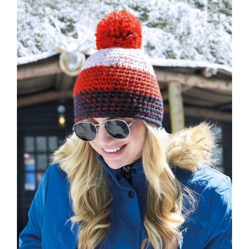 Hand knitted feel. Bold three colour stripe design. Suprafleece® thermal band. Luxury pom pom. Tear out label.