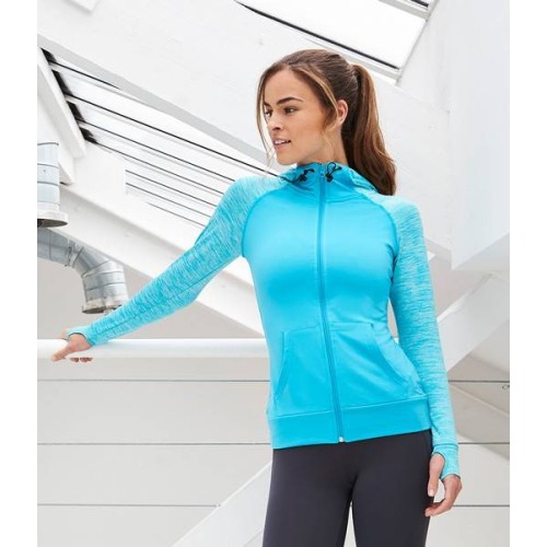 Hood and sleeves 92% polyester/8% elastane. DynamicCool™ responsive blended fabric. Contrast melange effect grown on adjustable hood and raglan sleeves. Taped neck. Full length zip. Front pouch pockets. Thumbholes on cuffs. Tear out label.