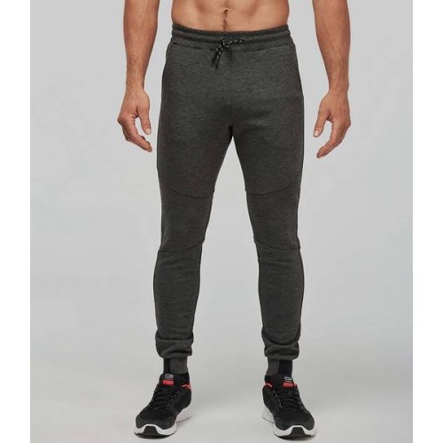 Slim fit. Elasticated waistband with two tone drawcord and plastic tips. Two side jersey lined pockets. Rear zip pocket. Knee patches. Elasticated leg ends.