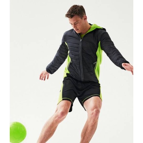 Contrast polyester taffeta lining. Warmloft micro insulation performance technology. Showerproof. Grown on hood with stretch bound opening. Full length zip with chin guard and inner zip guard. Power stretch side panels. Two front zip pockets. Stretch bound cuffs and hem. Reflective piping. Cut out label.