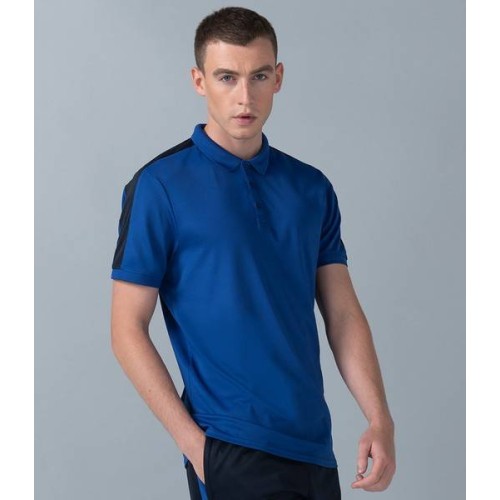Moisture wicking finish. High stretch fabric. Ribbed collar and cuffs. Taped neck. Three self colour button narrow placket. Contrast shoulder and sleeve panels. Twin needle hem. Tear out label.