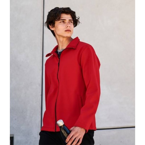 Warm backed polyester soft shell outer. Wind resistant membrane. Showerproof. Collar high contrast full length zip with inner zip guard. Two front pockets. Open cuffs. Drawcord hem. Cut out label. Ideal for screen, transfer and vinyl printing.