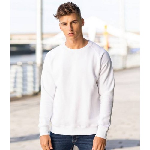 Soft cotton faced fabric. Brushed back fleece. Raglan sleeves. 2x2 ribbed collar, cuffs and hem. Twin needle stitching. Tear out label.
