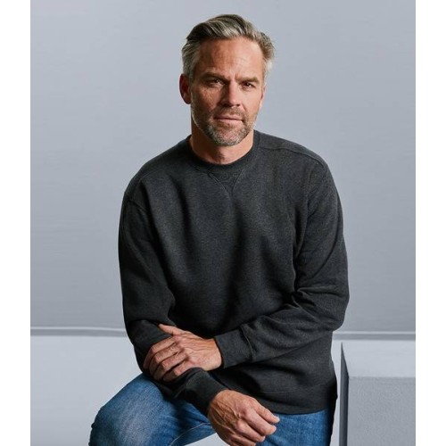 Brushed back fleece. 100% cotton outer layer. Drop shoulder style. Straight modern cut. Elastane ribbed collar, cuffs and hem. Herringbone taped neck. V detail at front neck. Locker patch. Offset shoulder seams. Coverseamed armholes, cuffs and hem. Unbranded size label.