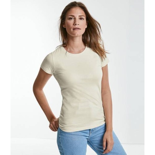 Shaped fit. Narrow ribbed collar with Lycra®. Taped neck and shoulders. Side seams. Twin needle sleeves and hem. Unbranded size label at neckline.