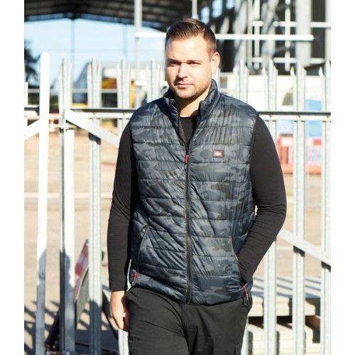 Polyester padding and lining. EN342 thermal grading. Showerproof and windproof. Slim fit. Camo print fabric. Collar high full length zip. Elasticated bound armholes and hem. Two front zip pockets. Branded rubber badge on left chest.