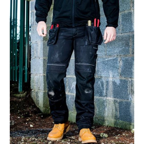 Contrast fabric 100% polyester oxford 600D. Gripper elastic inner waistband. Side elasticated waistband with belt loops. Zip fly with button over. Two side pockets. Rear patch pockets. Two holster pockets one with concealed drop down ID holder. Double ruler pocket. Easy access cargo pocket. Media pocket. Hammer loop. D-ring for keys or ID cards. Top loading knee pad pockets - knee pads included. Reinforced contrast panels. Adjustable leg length reg 31'" to tall 33'". Contrast stitching. Triple stitched seams.