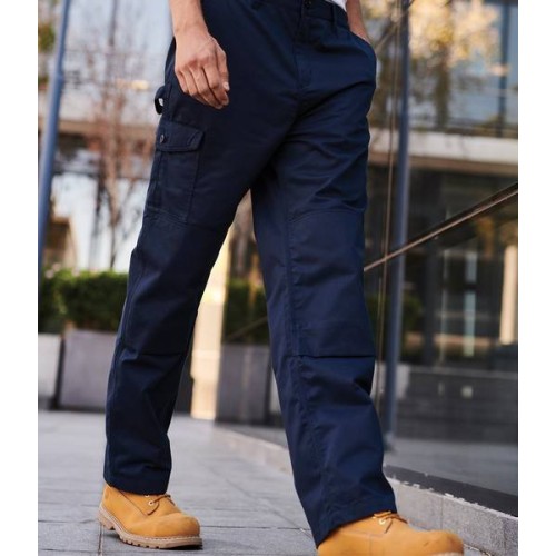 Water repellent finish. Part elasticated waistband with belt loops. Zip fly with button over. D-ring attachment. Two side pockets. Rear pockets. Reinforced crotch seam. Side cargo pocket with button closure. Hammer loop. Side leg ruler pocket. Knee pad pockets. Triple stitched seams. Cut out label.