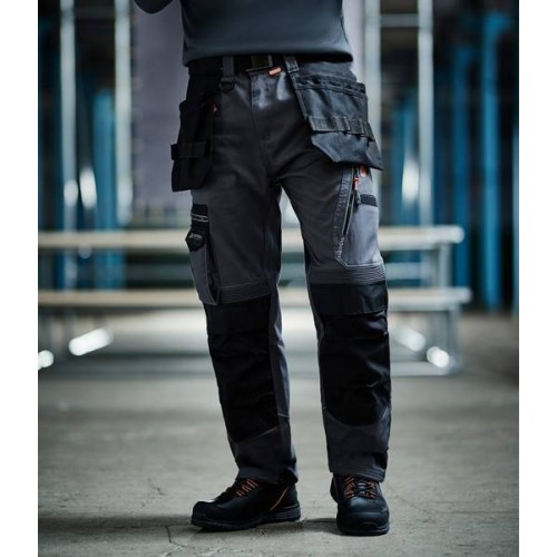 Slim fit. High shaped back waistband with belt loops and D ring attachments. Inner anti-slip waistband. Zip fly with button and shank button over. Foldaway holster pockets with multiple compartments. Two side pockets. Right hip zip pocket. Reinforced crotch seam. Two multi-function tool and mobile phone pockets on legs with reflective piping. Elasticated panels above knees for ease of movement. Cordura® top loading knee pad pockets. Drawcord hem with reinforced hem overlay. Triple needle stitching. Reflective piping on rear of legs. Branding on left waistband, rear belt loop, rear and lower leg pockets.